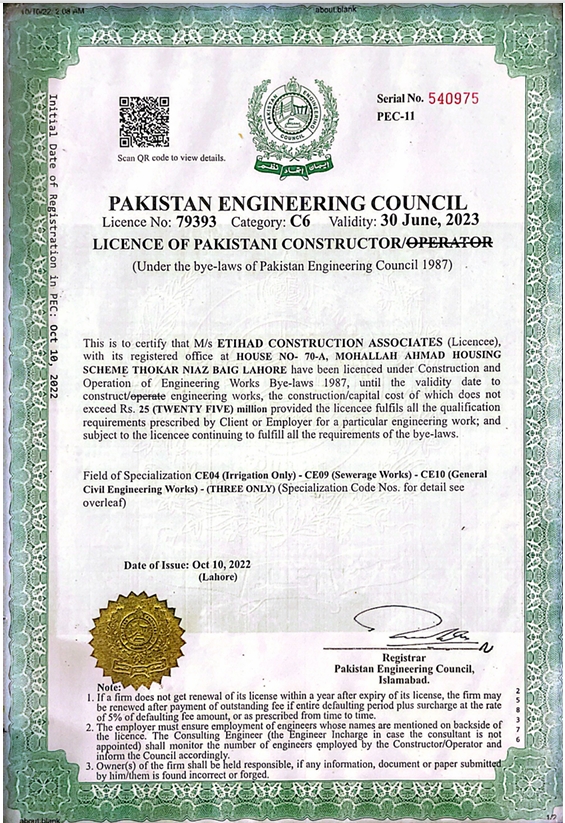 Yes, we are a fully licensed company registered with the Pakistan Engineering Council (PEC)